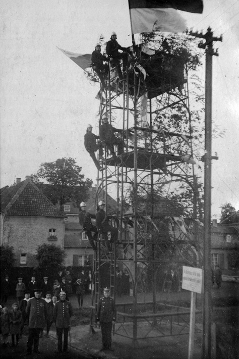 Das Bild zeigt eine damalige Einheit, die als Vorentwicklung der heutigen Höhenretter angesehen werden kann und als "Steigerabteilung" bezeichnet wurde. Die Aufnahme stammt aus dem Jahr 1912 und zeigt die Steigerabteilung, Jüchener Mitbürger und den neuen, eisernen Steigerturm, der als Ersatz für einen im Jahr 1903 erbauten und im Jahr 1912 einem Sturm zum Opfer gefallenen Vorgänger, errichtet wurde. Das im Hintergrund zu sehende Gebäude steht außerdem heute auch noch und ziert als Logo z.B. auch unser Profilbild: das Jüchener Haus Katz.
