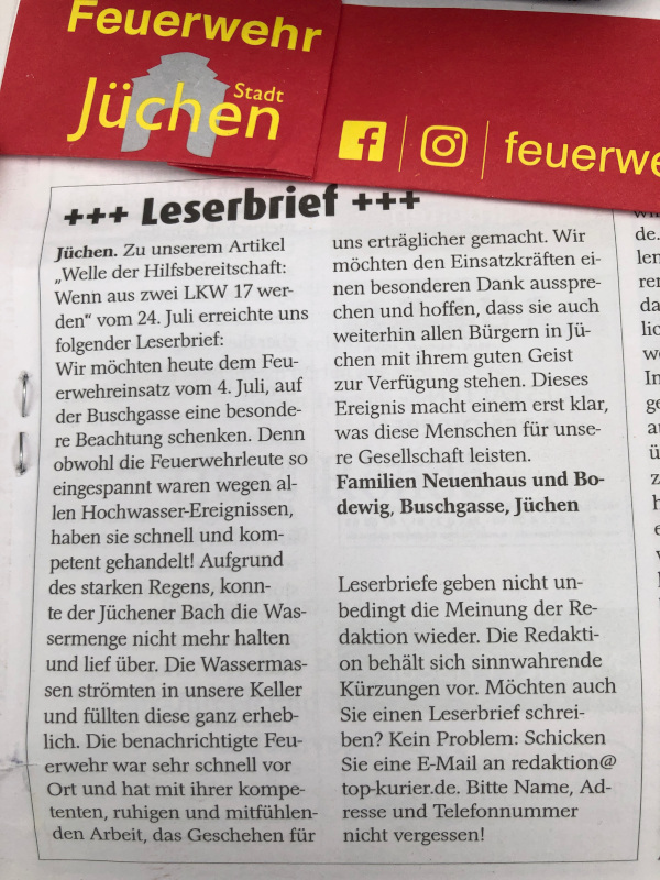 Am 04.07. beschäftigten trotz stärkerer Regenfälle einige wenige Einsätze die Feuerwehr. Einer dieser Einsätze sorgte für einen rund 4 stündigen Einsatz und in der aktuellen Ausgabe des Top Kuriers (Seite 13) konnten wir nun einen Leserbrief der betroffenen Anwohner finden mit einem Wort des Dankes.