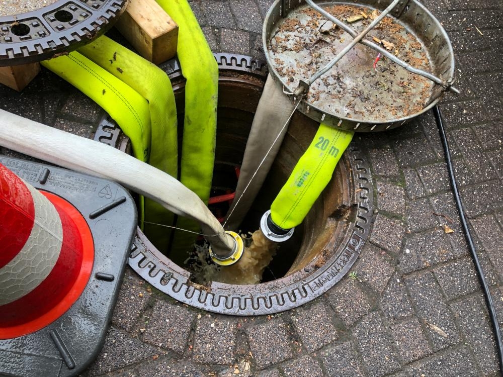 Während die Einsatzstellen in den östlich gelegenen Ortsteilen schnell abgearbeitet werden konnten, gestaltete sich die Einsatzlage auf der Buschgasse als schwierig. Eine größere Gartenanlage stand hier bis zu einem halben Meter inklusive einem Gartenteich mit Zierfischen unter Wasser. Aufgrund des Wasserdrucks wurden Fenster im Kellerbereich eines Wohngebäudes eingedrückt und überschwemmten den Kellerbereich ebenfalls auf rund einem halben Meter. Auch ein zweites Wohngebäude erlitt sowohl im Erdgeschoss als auch Kellerbereich einen größeren Wasserschaden. Da aus der Gartenanlage stetig weiteres Wasser nachfloss, begannen die ersteintreffenden Kräfte das Nachfließen des Wassers zu stoppen, was letztendlich nur mit weiteren Kräften und mobilen Hochwasserschutzbarrieren gelang. In den folgenden Stunden waren hier insgesamt Kräfte aus 3 Einheiten, der Rüstwagen und Führungsdienst im Einsatz und setzen zwischenzeitlich eine Tragkraftspritze (bis zu 1600 Liter/Minute) in der Gartenanlage, sowie 6 Tauchpumpen (je zwischen 800-1200 Liter/Minute) in beiden Wohngebäuden ein. Da sich beim Abpumpen der Massermassen aus der Gartenanlage das verdreckte Wasser im Teich sammelte und hier für eine Gefährdung der Zierfische sorgte, wurde Frischwasser zugeführt, welches wieder für eine Sauerstoffanreicherung sorgte.